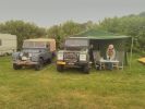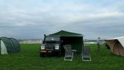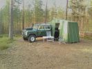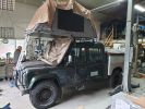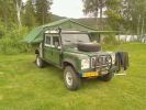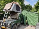 Supergave Defender 130 TD5 met kampeerunit en daktent zodat er 4 à vijf slaapplaatsen zijn.